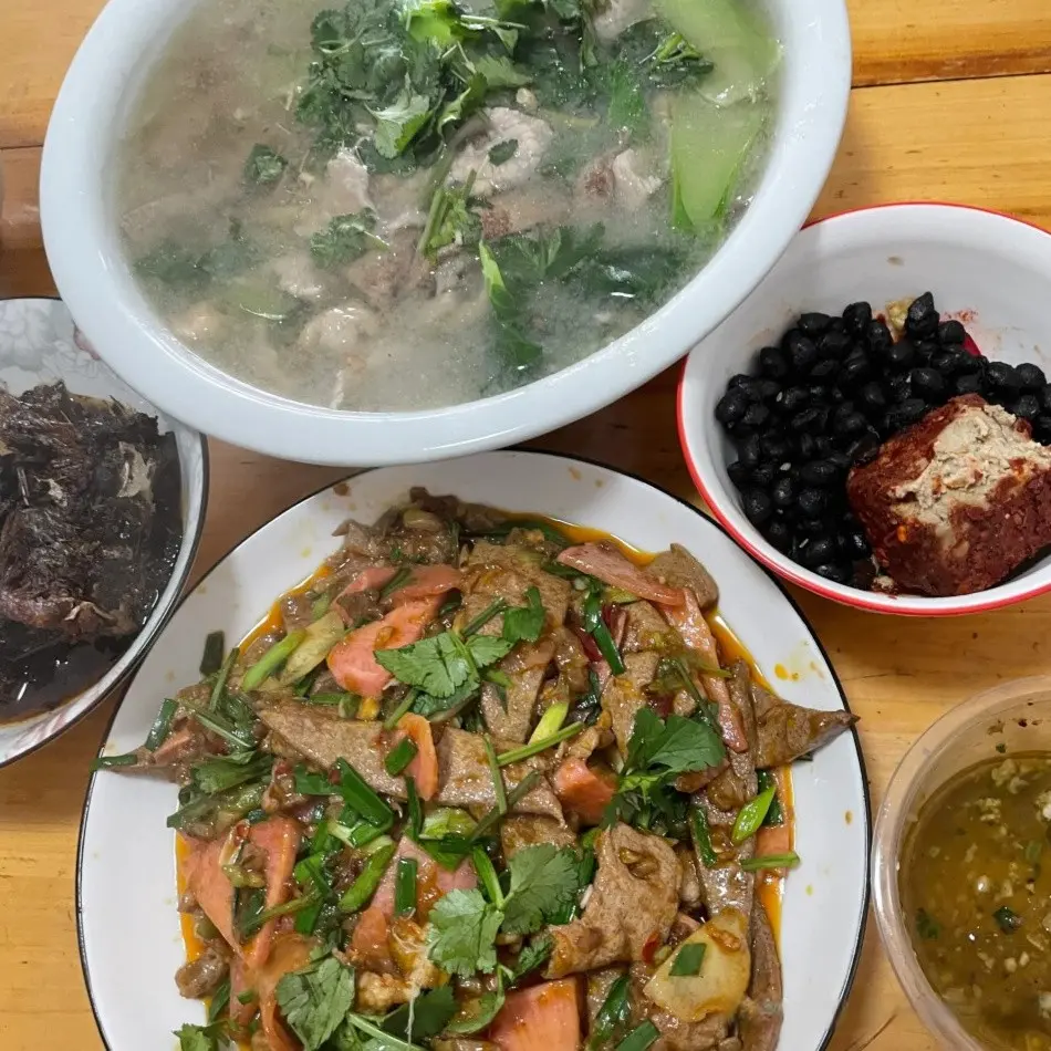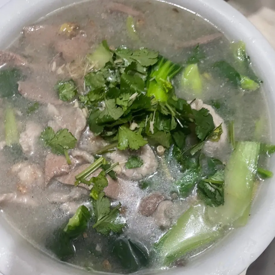 第二道菜是肉片汤,这道菜的做法很简单。也是把瘦肉腌制一下,剩下的猪肝也一起倒入锅里,用的是猪油,口感丰富而味道好。加了黄瓜片和上海青,起锅时再把剩余的香菜倒入其中,散发着独特的香味,清清淡淡的蔬菜可以中和油腻,让汤底更鲜美。这样的肉片汤瘦而不柴鲜嫩无比,汤底也是很鲜甜,吃起来又清淡爽口,真是特别开胃。这都是吴倩宁在回家前去市场买的新鲜猪肝和肉片,就为了能在家吃一顿家常便饭。