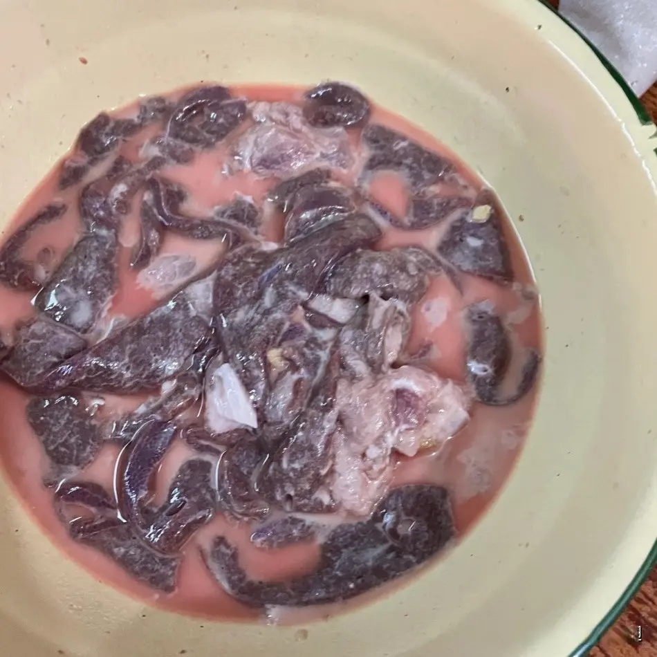 第一道菜是泡菜炒猪肝,猪肝处理得很干净,没有异味,膈膜都剃掉了,泡菜是胭脂萝卜,红艳艳的很诱人,是吴倩宁自己泡的咸淡适中很脆爽,虽然好几天不在家,居然没有坏掉,还是那么的清脆诱人,让人忍不住流口水,切的时候就忍不住吃了起来,觉得太爽口了。